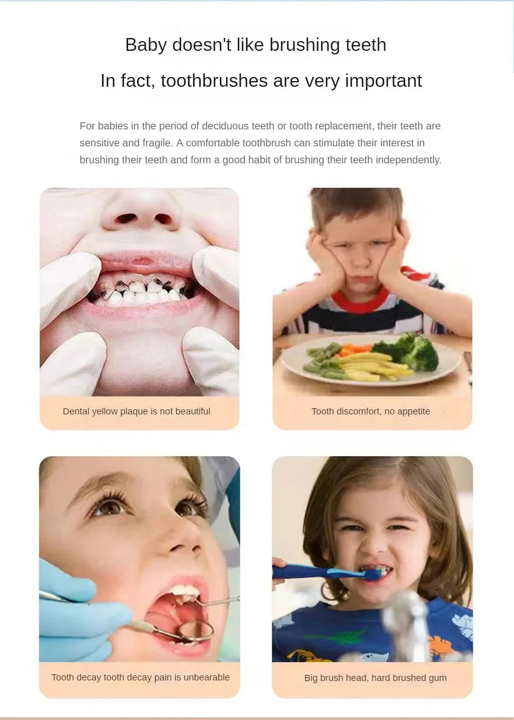 かわいい恐竜型デザインで、歯磨きが楽しくなる子ども用歯ブラシです。赤ちゃんや小さなお子さまの歯と歯茎にやさしい超ソフト毛を採用。10,000本もの高密度クラウド状毛で、0.12mmの繊細な毛先が歯茎を傷つけず、しっかりケアします。