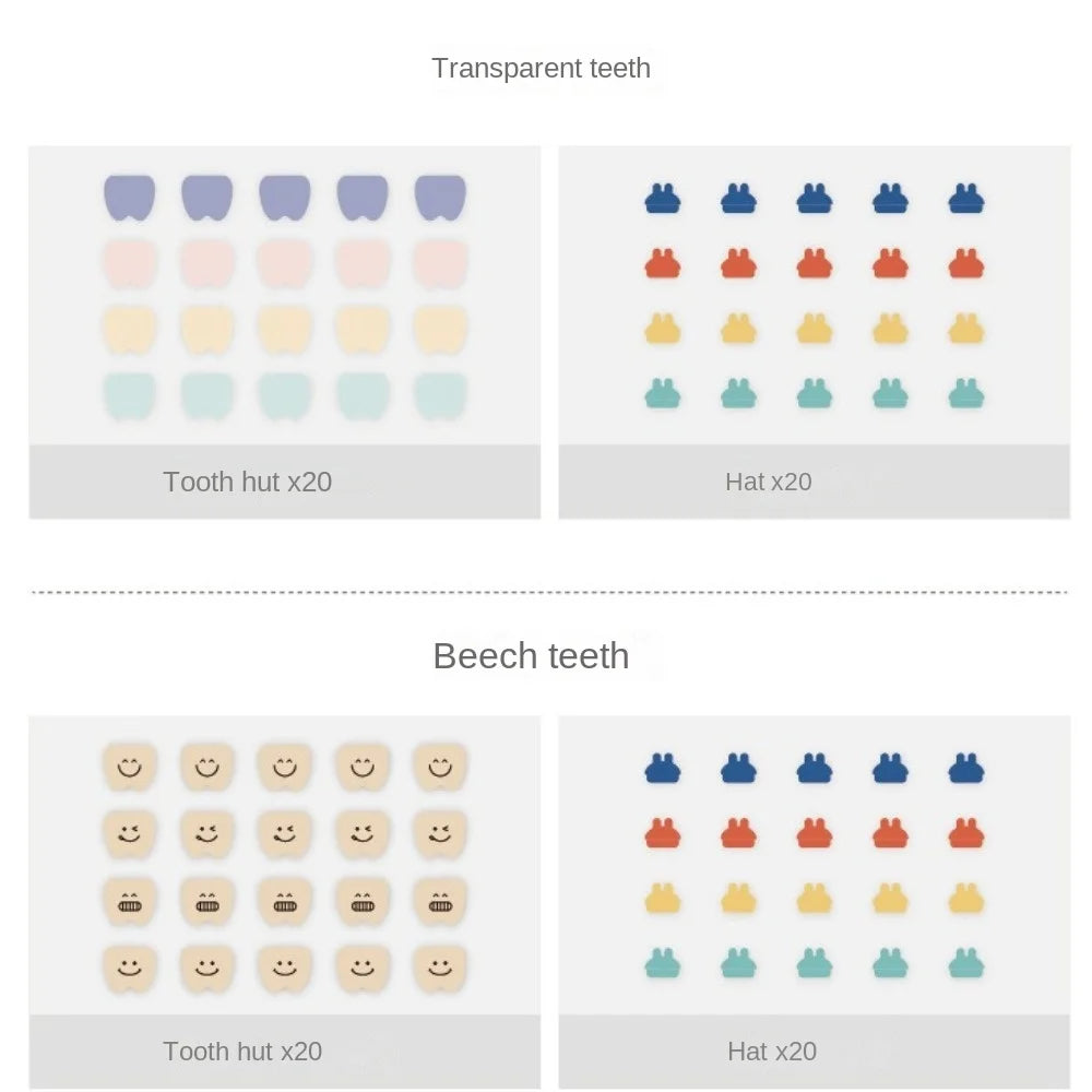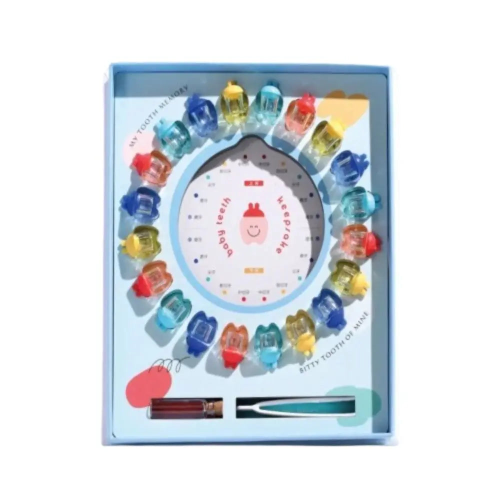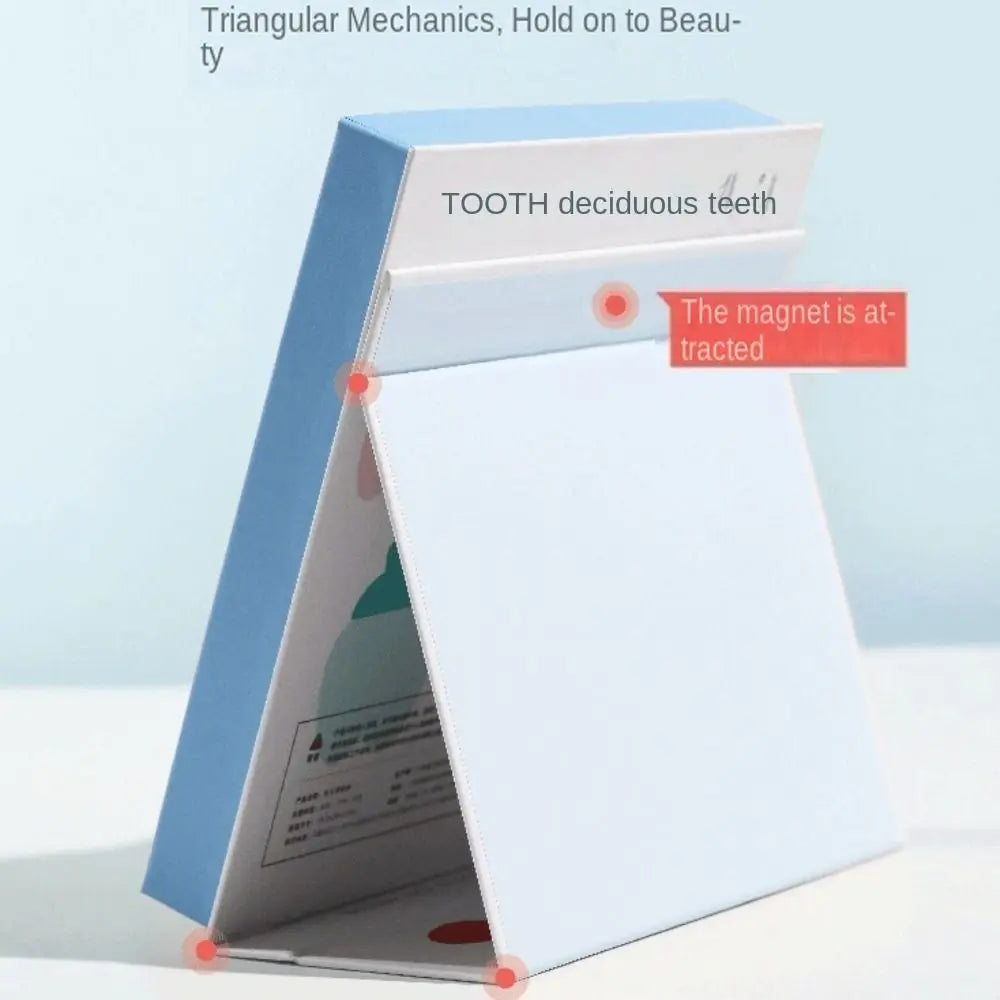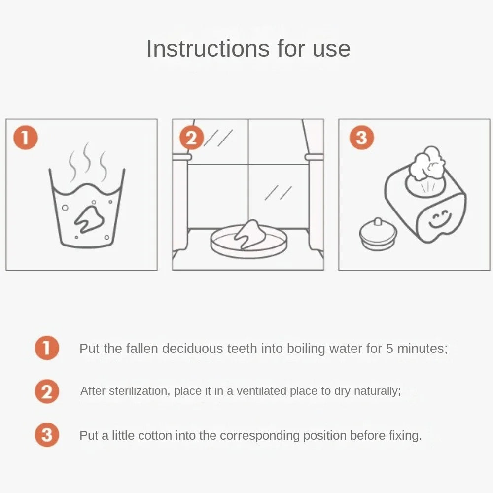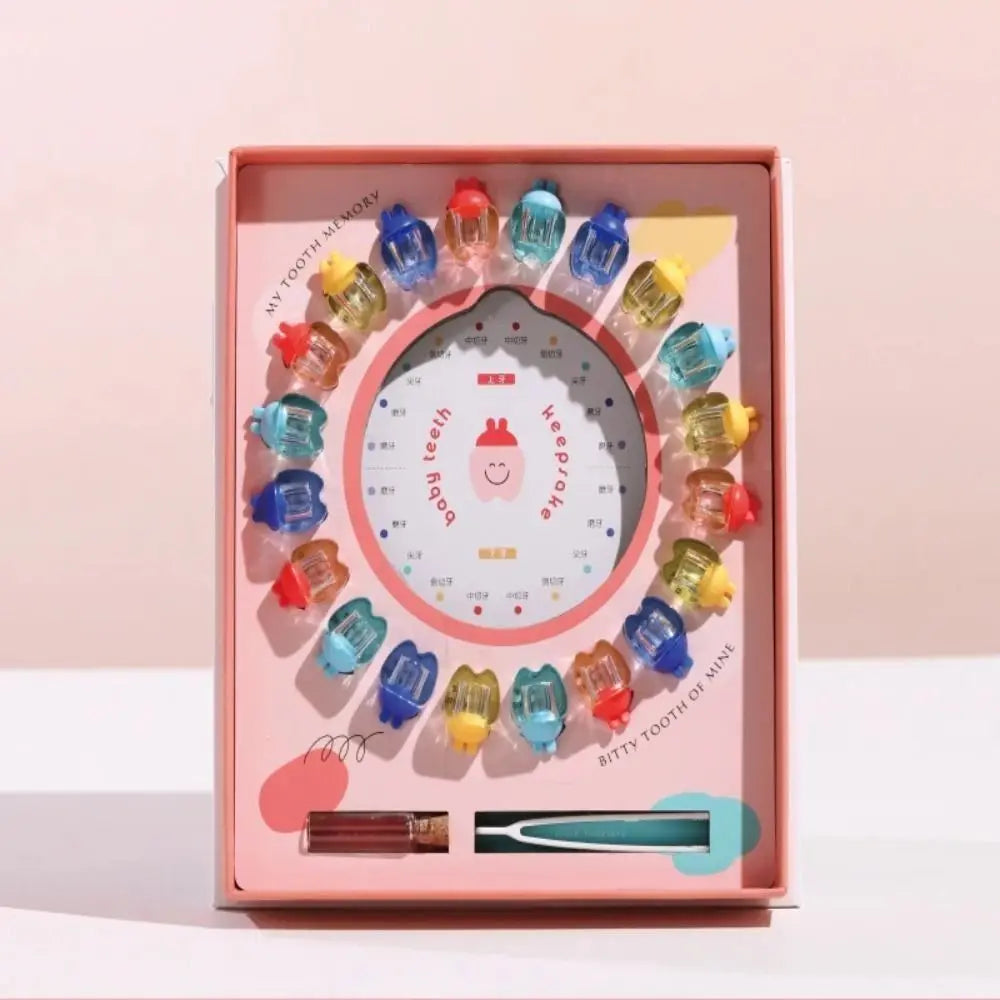 歯の形に沿って配置された収納スペースで、どの歯がどこにあるか一目で分かります。付属のステッカーに歯が抜けた日付を書いて記録することも可能です。乳歯が抜ける時期に備え、モーラーホールは他製品より広めに設計され、ほとんどの乳歯に対応。小さな綿を入れれば歯が沈む心配もありません。