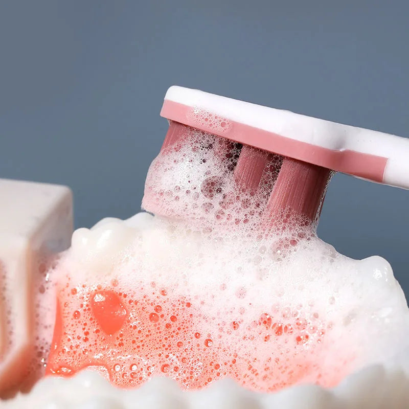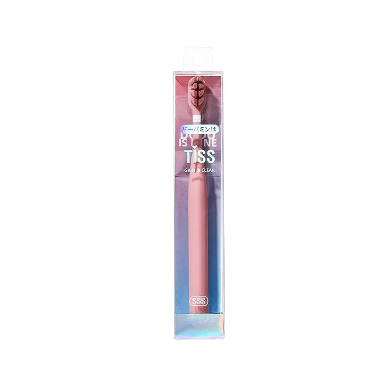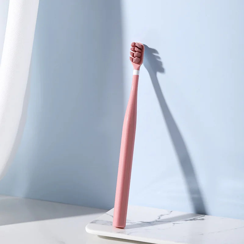 繊細で柔らかい毛先の大人用歯ブラシです。敏感な歯や歯茎をやさしくケアし、丸みを帯びたブラシヘッドが口内の隅々までしっかりと洗浄します。毛先は束ごとに植え付けられており、清潔で衛生的な使用が可能です。三角カーブのハンドル設計は手のひらにフィットし、力を入れすぎず快適に歯磨きできます。