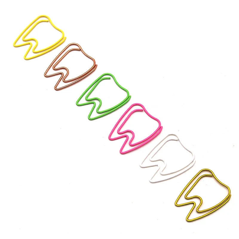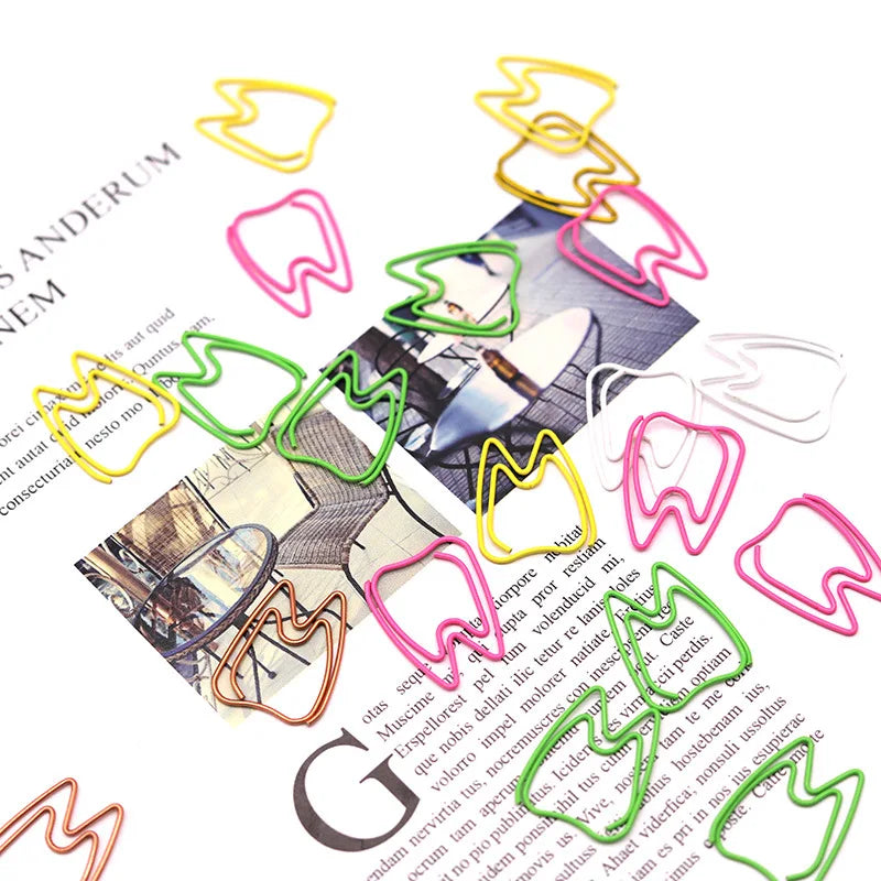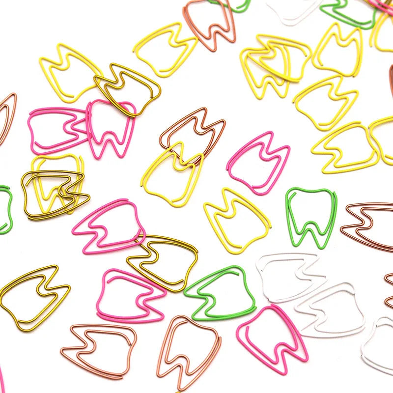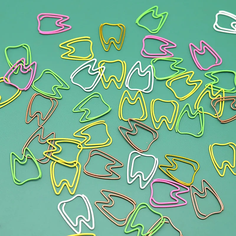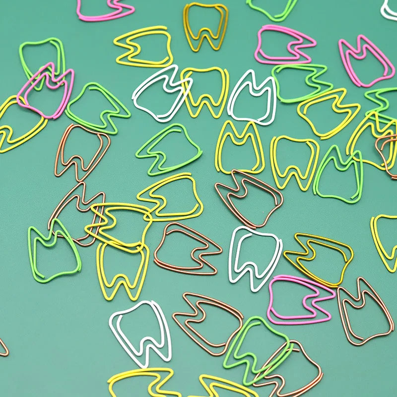 歯の形をモチーフにした可愛いペーパークリップ20個入りです。耐久性のあるスチール製にプラスチックコーティングを施しており、書類やファイルの整理に便利です。個性的なデザインで、デスク周りを楽しく彩りながら、書類の分類や固定に役立ちます。